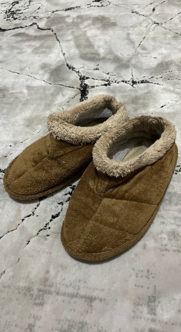 Kahverengi, yumuşak kürk detaylı ve sade tasarımlı ev terliği, sıcaklık sağlar. Defoları resimlerde bellidir