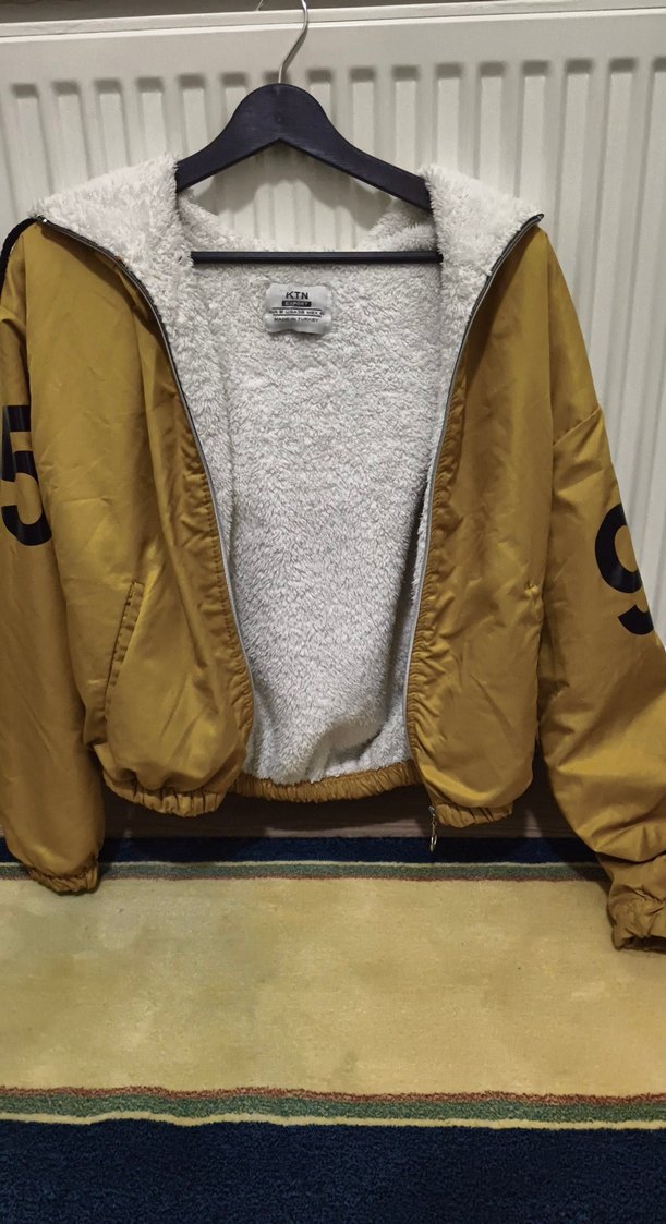 Kahverengi, bol kesim, uzun kollu ve yuvarlak yakalı kadın ceket. Parlak baskılı dış yüzey ve sıcak peluş detaylı iç astar bulunur. Günlük kullanıma uygundur.