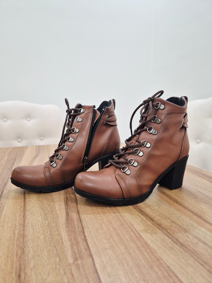 Kahverengi deri, tok topuklu ve tokalı detaylara sahip kadın botları. Parlak ve desensiz, bağcıklı ön ve yan fermuarlı günlük kullanıma uygun. sayili kullanıldı Topuklu giyemediğim için kullanamadim sıfırdan farksız