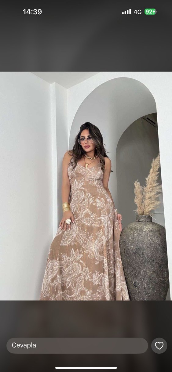 Kahverengi renkli, yaskılı, drapeli uzun elbise. İpek gibi yumuşak kumaştan, bol kesim