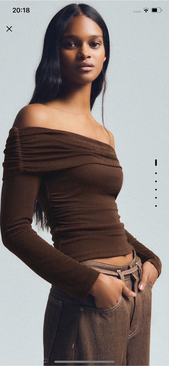 Kahverengi süet bluz, tekne yakalı ve drapeli detaylara sahip. Uzun kollu, normal midi boyda, rahat sokak stili için uygun.