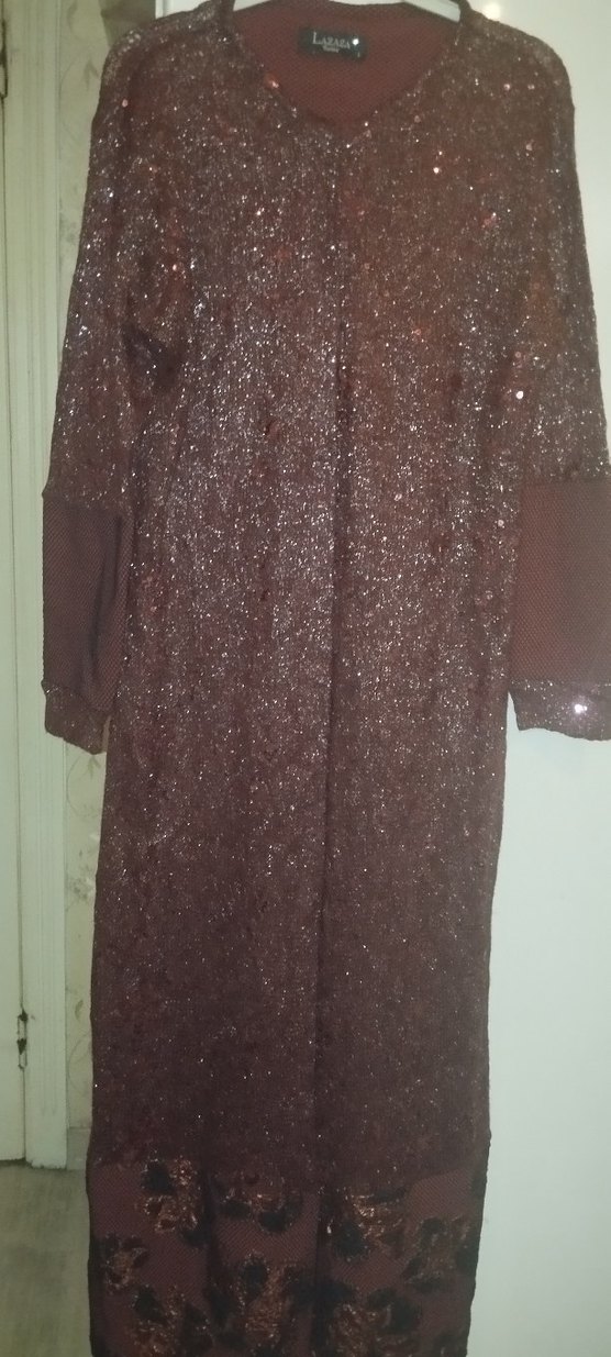 Kahverengi, simli, uzun kollu, notched lapel yaka detaylı, sentetik kumaştan yapılmış, düğün için uygun, rahat kesim uzun elbise. ✨
