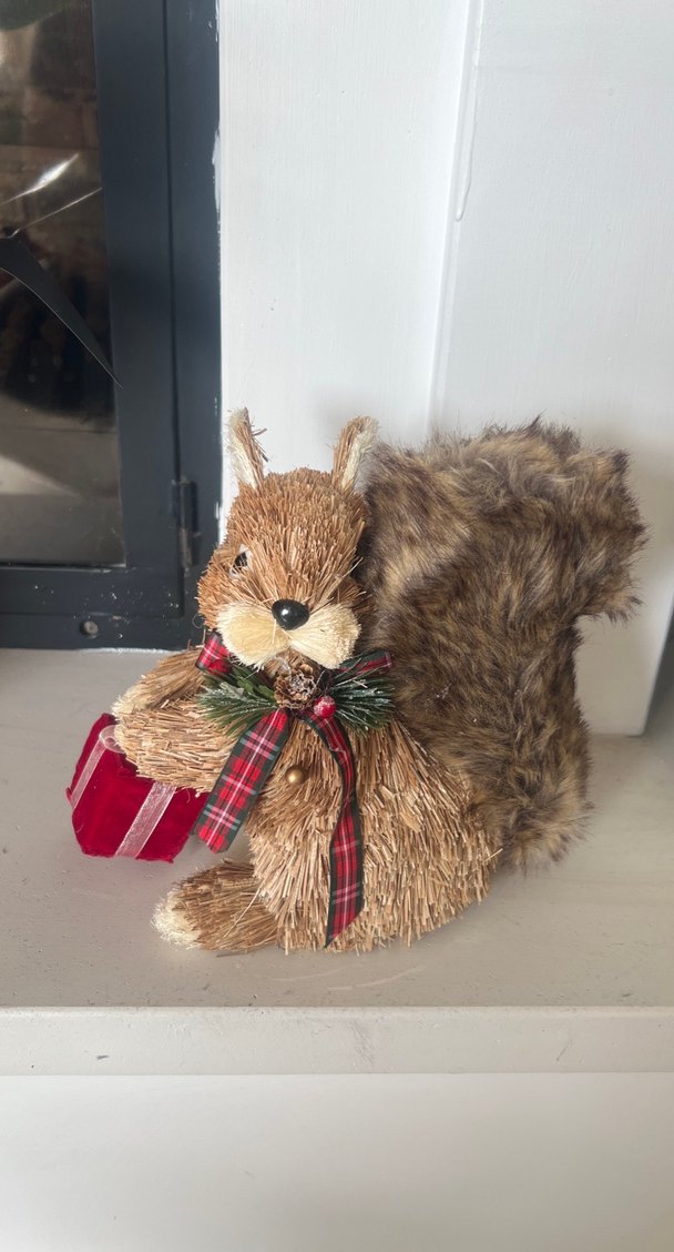 Kahverengi sincap figürü, kırmızı hediye kutusu tutuyor. Ekose kurdele ve çam süslemeleriyle dekore edilmiştir. Kuyruğu yumuşak tüylüdür.