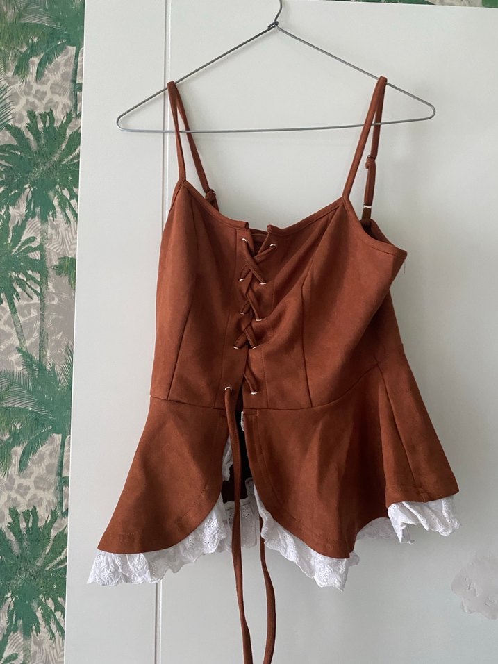 Kahverengi, sırtı bağcıklı ve beyaz dantel detaylı, midi boy, vücuda oturan hemşire korsesi. Düz ve desensiz kumaştan yapılmıştır.