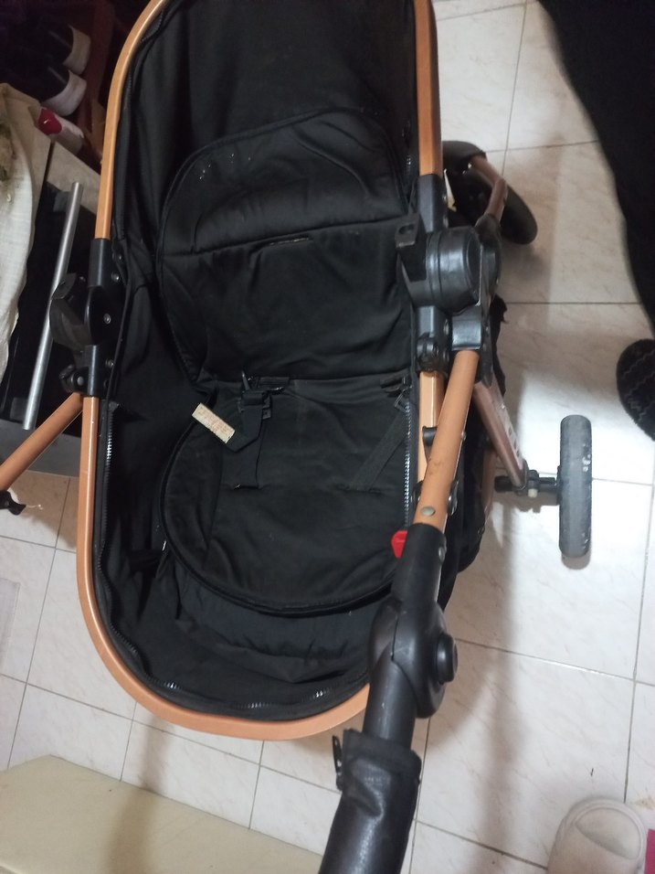 Kahverengi siyah bebek arabası, güvenlik kemerli rahat oturma yeri ve sağlam tekerleklerle kolay hareket sağlar.
