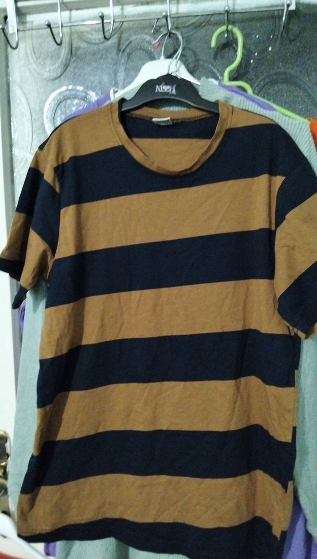 tişört kısa kollu, yuvarlak yakalı ve bol kesimdir. Kahverengi ve siyah yatay çizgilerle rahat sokak stili sunar, sentetik kumaştan yapılmıştır. Günlük kullanım için zahmetsiz şıklık sağlar.