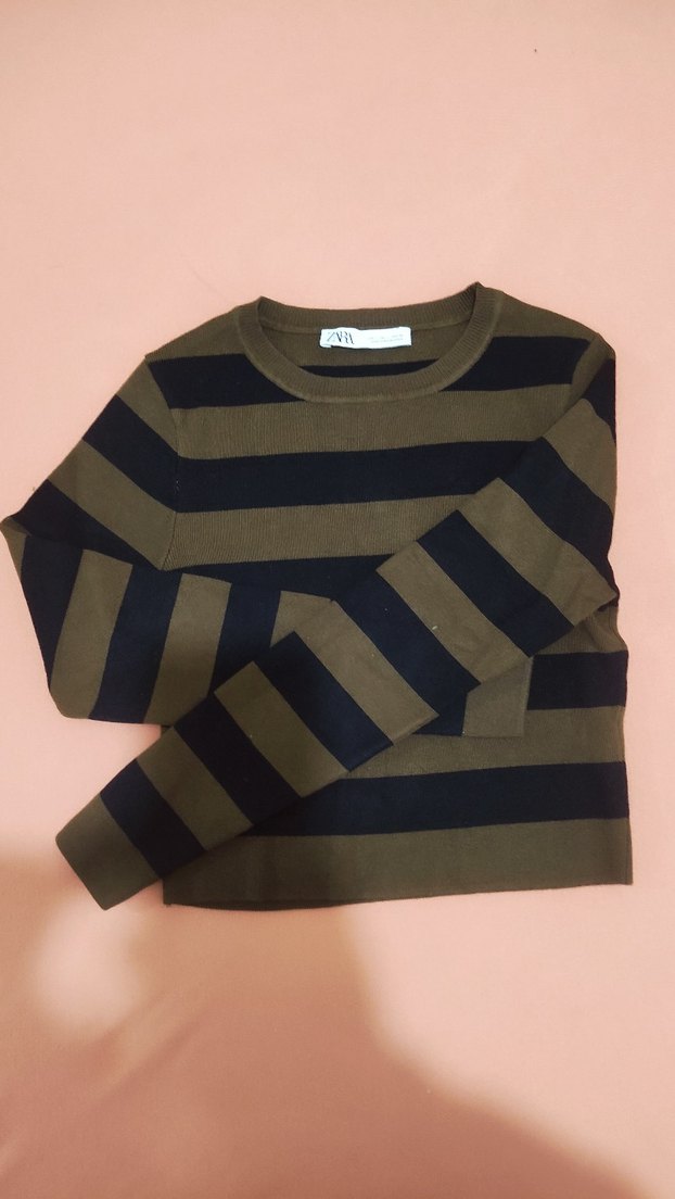 Kahverengi ve siyah çizgili, uzun kollu ve bisiklet yaka, vücuda oturan triko kazak. Normal midi boyda, rahat ve şık bir günlük kombin parçası.
