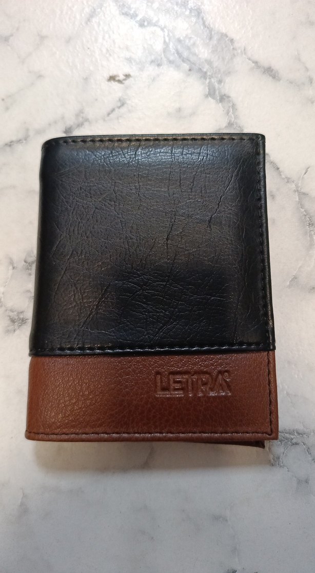 Kahverengi ve siyah renklerin birleşiminden oluşan erkek cüzdanı, önünde LETRA logosu kabartmalı olarak yer alır. 8 kart 1 para bölmeli