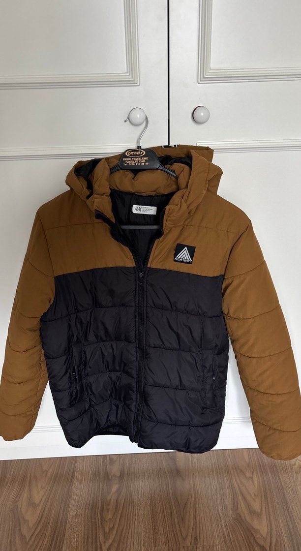Kahverengi ve siyah renk bloklu, kapüşonlu ve fermuarlı, yumuşak ve sıcak kumaştan üretilmiş, dar kesim erkek çocuk mont. cep astarında çok az bir söküklük var