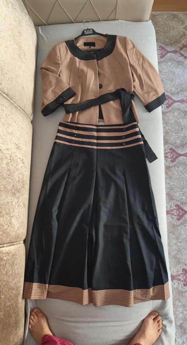 Kadın takımı uzun, regular fit, kuşaklı, satenimsi kumaş, askılı kollu ve kesik yaka detaylıdır. Ofis için modern klasik tarzda kahverengi ve siyah renkler içerir.