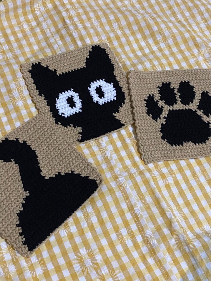 Kahverengi Siyah Örgü Kedi seti bardak altlığı