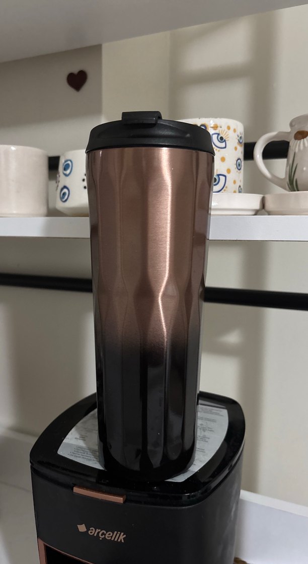 Kahverengi ve siyah renk geçişli, siyah kapaklı uzun termos bardak. Sıcak veya soğuk içecekler için uygundur. Çelik ☕
