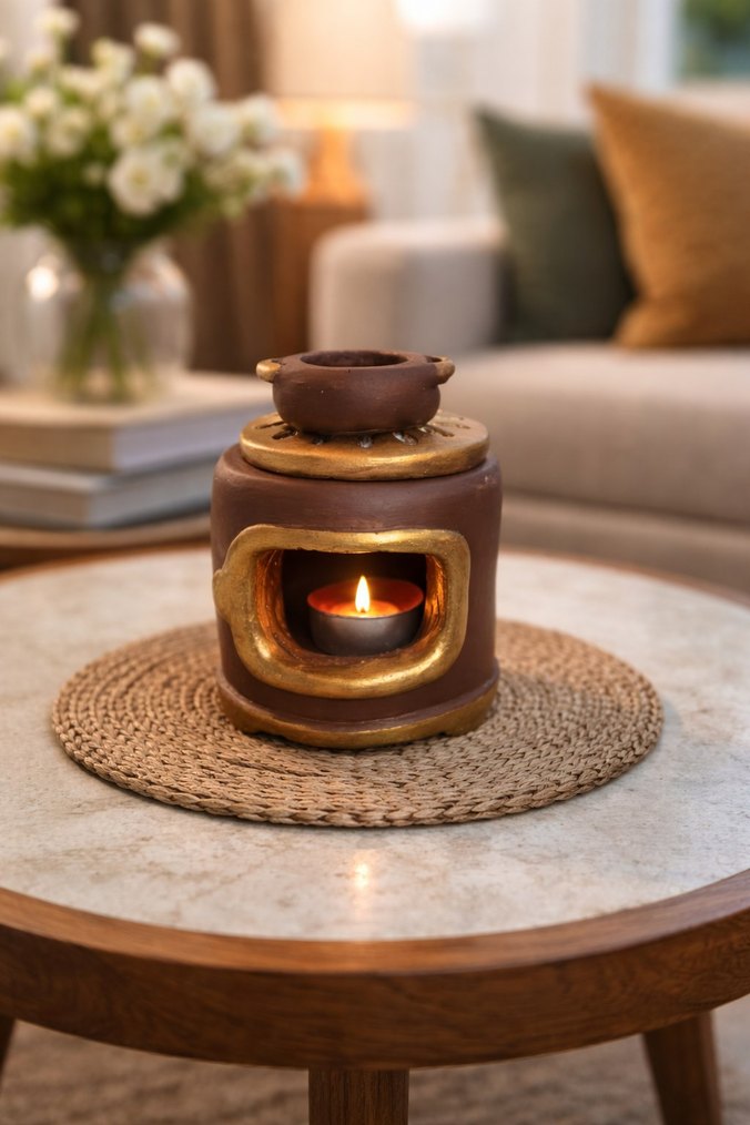 Altın detaylı koyu kahverengi siba mumluk, küçük tealight mumlar için uygundur. Ortama sıcaklık katar. ️