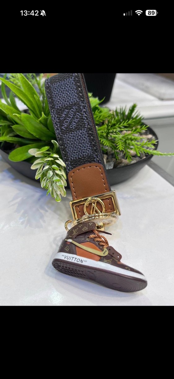 Kahverengi mini sneaker tasarımlı, detaylı bağcık ve markalı kayışlı anahtarlık. Sokak stilini günlük kullanıma taşıyor.