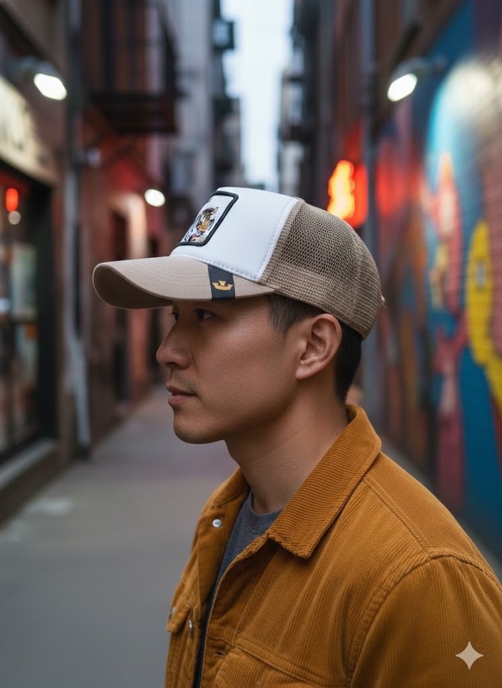 Önü kaplan işlemeli ve "TIGER" yazılı, açık kahverengi renkli erkek sokak stili şapkasıdır. Arka kısmı file detaylıdır.