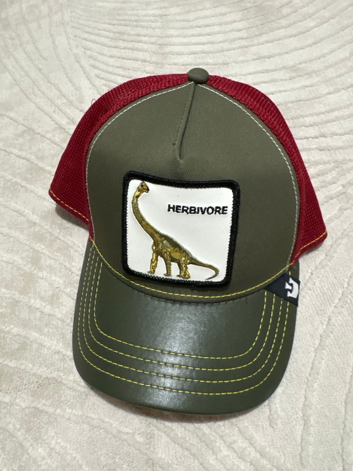 Kahverengi ön kısmında 'HERBIVORE' yazılı dinozor işleme bulunan, koyu kırmızı file arka kısmı ile spor ve rahat tarzı birleştiren şapka. Şirket hediye etti hiç kullanmadım çok kaliteli