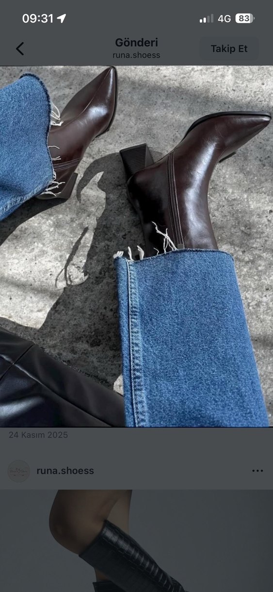 Kahverengi denim botlar, stiletto topuklu ve kemerli detaylıdır. Trend sokak stiline uygun, günlük kullanıma idealdir.