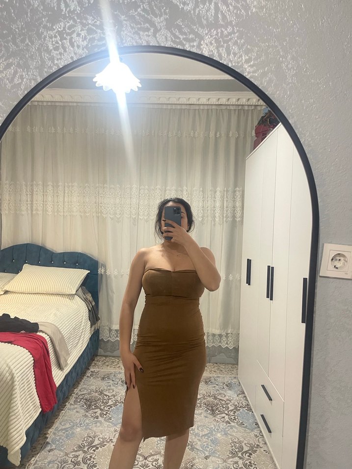 Kahverengi straplez midi elbise, yumuşak süetten yapılmış, vücuda oturan ve kolsuz tasarıma sahip. Minimalist sokak stiliyle romantik akşamlar için uygun, zahmetsiz şıklık sunar.