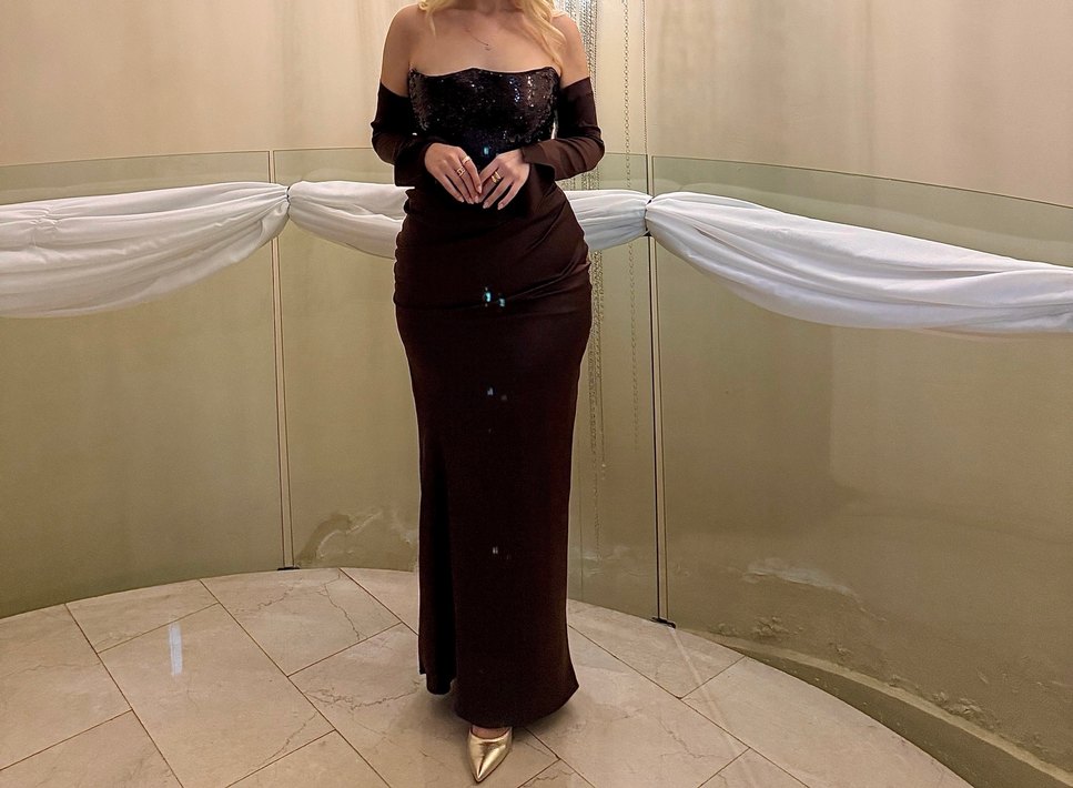 Kahverengi straplez, uzun kollu, drapeli ve nakışlı işlemeli, klasik zarafette dar kesim uzun abiye elbise. Romantik gece için uygun.