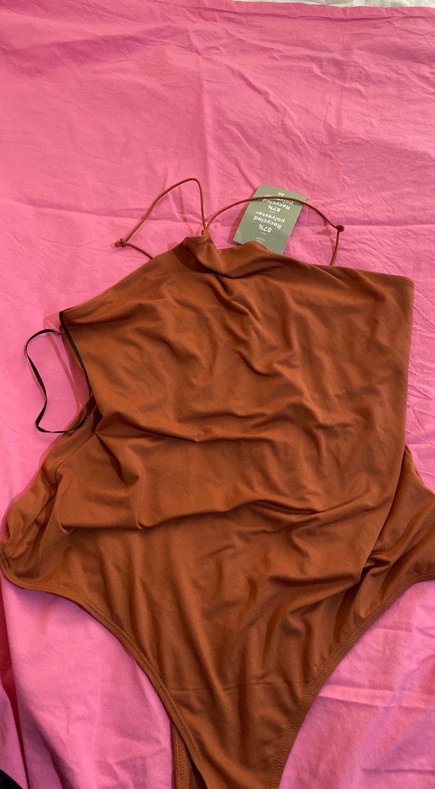 Kahverengi, askılı ve vücuda oturan bu kadın body midi boyda, zıbınlı ve desensizdir. Günlük kullanım için şık ve rahat bir tercih sunar.