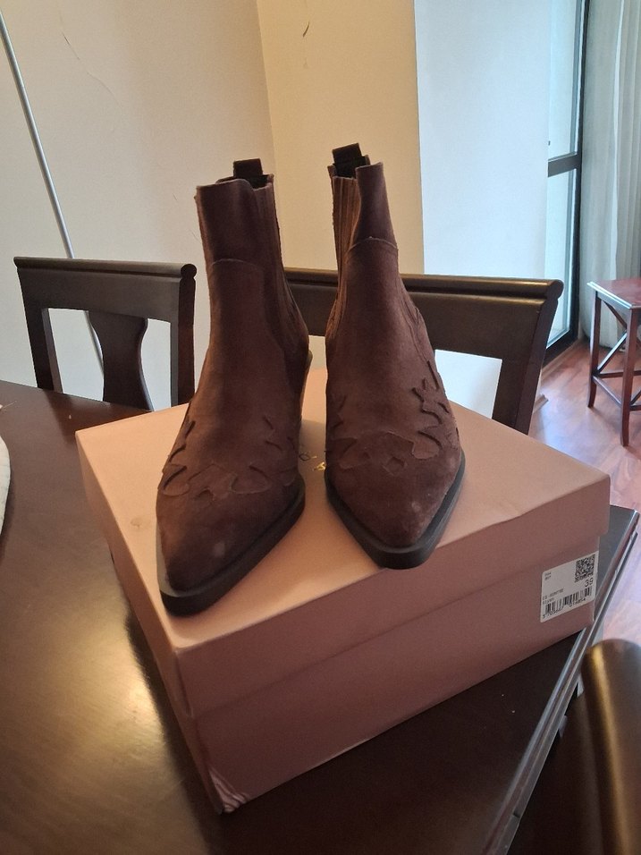 Koyu kahverengi süet stiletto topuklu, nakış detaylı botlar. Günlük rahat kullanıma uygun bohem tarzda. 39 numaradır.Hiç giyilmemiştir.
