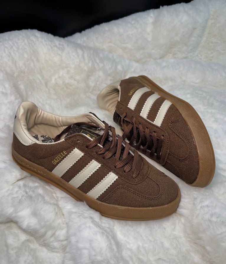 Kahverengi süet Adidas Gazelle sneakers, bağcıklı ve koyu zebra desenli tabanlı. Beyaz çizgili, stiletto topuklu şık sokak stili ayakkabı. 36-37-38-39-40 vardr