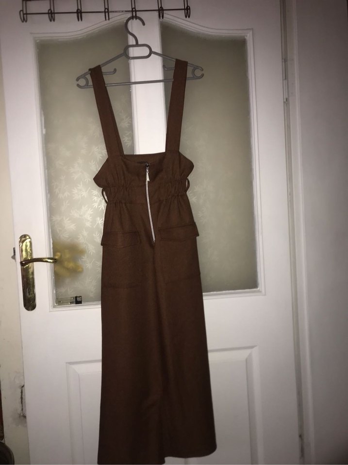 Kahverengi süet kumaştan, askılı ve straplez yaka tasarımlı, kemerli ve uzun kesim kadın tulumu. Minimalist ve şık bir sokak stili sunar.
