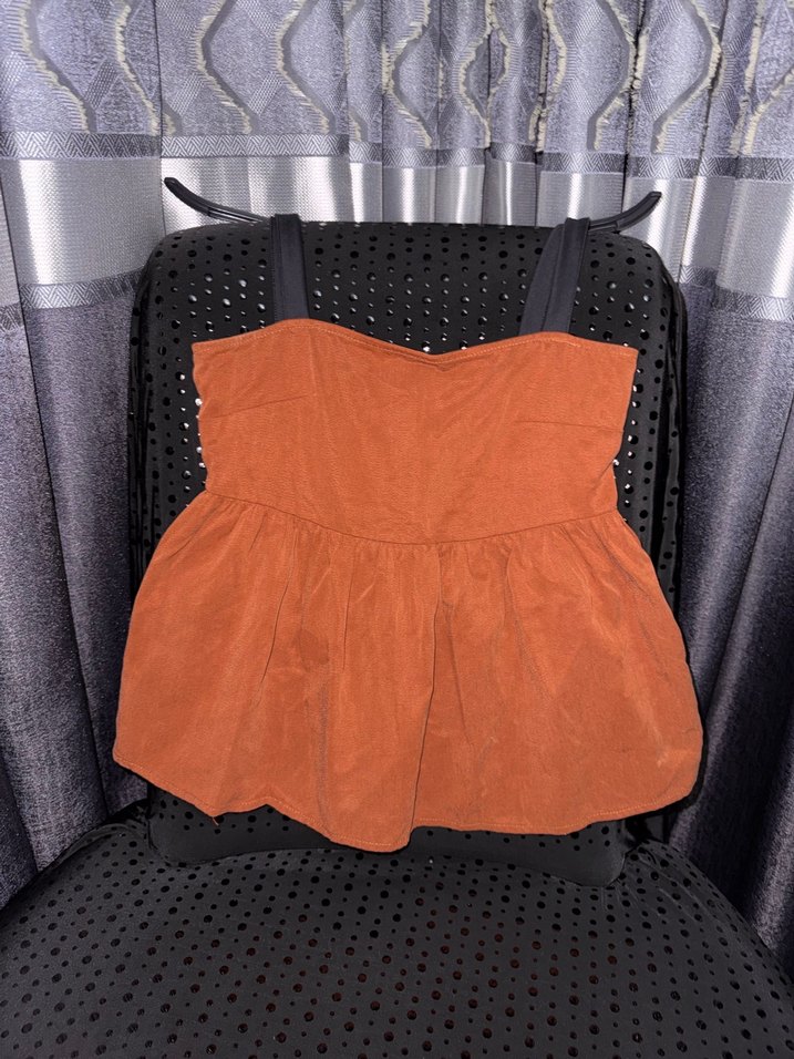 Kahverengi süet kız yeleği, askısız yakası ve kolsuz tasarımıyla bel kemerli ve bol kesimdir. Sokak modası için uygundur.