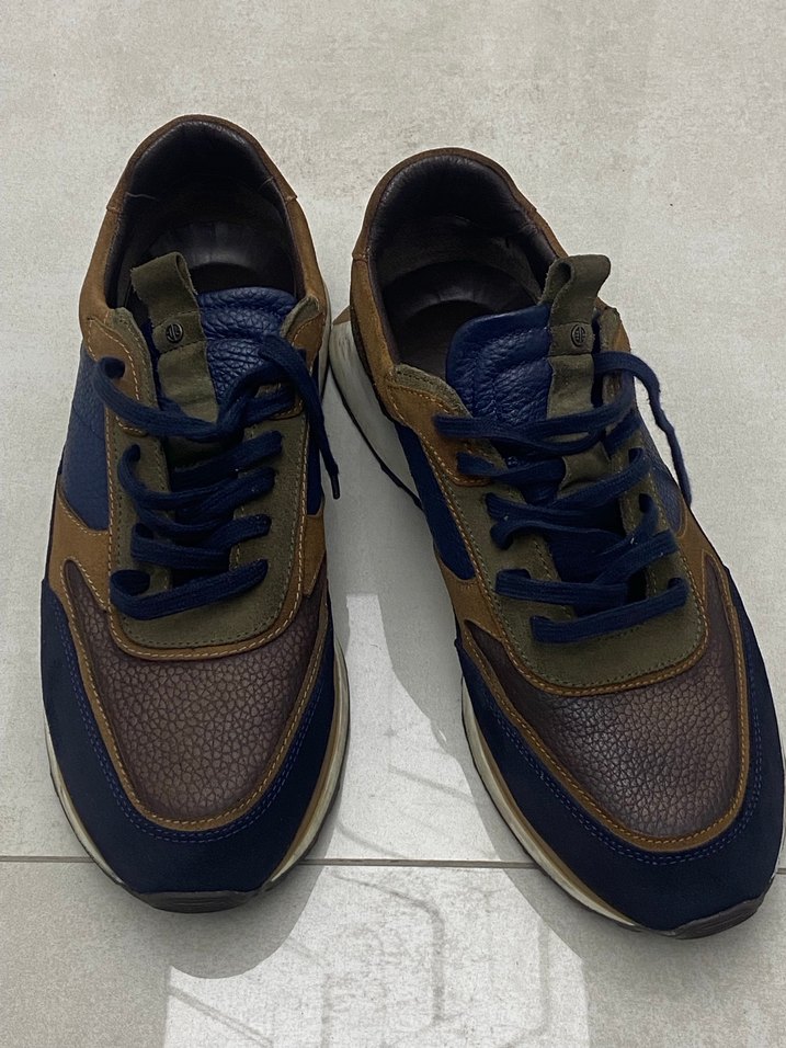 Koyu kahverengi süet ve lacivert detaylı, bağcıklı erkek spor ayakkabısı, sokak modasına uygun.