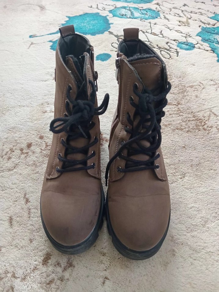 Kahverengi süet, bağcıklı ve tokalı kiz çocukbot Siyah bağcıkları ve gündelik kullanıma uygun sade tasarımı vardır.