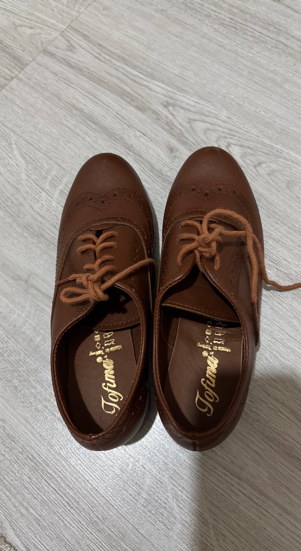 Kahverengi süet malzemeden yapılmış, bağcıklı ve kama topuklu kadın klasik ayakkabısıdır. Günlük kullanıma uygun, normcore tarzda, desensiz ve koyu renklidir.