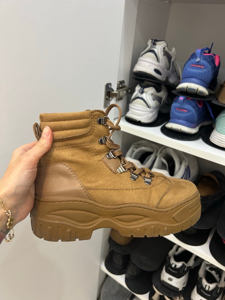 Açık kahverengi süet, bağcıklı platform topuklu botlar, kamuflaj desenli, günlük sokak stiline uygun. Sadık Yılmaz’dan aldım ama içinde markası yazmıyor, bir sorunu yok.