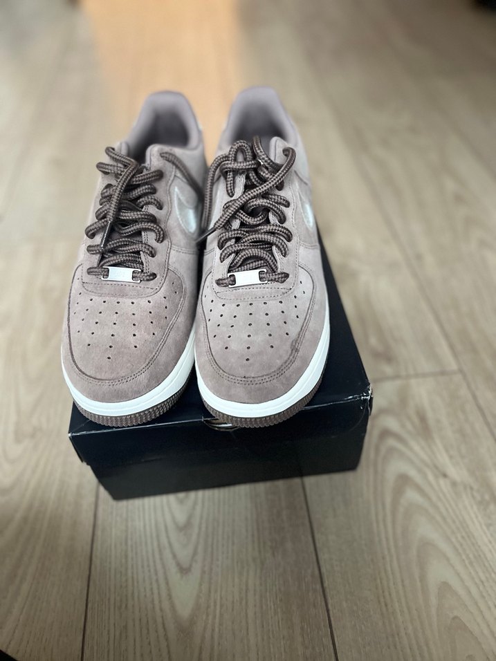 Kahverengi süet, bağcıklı, stiletto topuklu, desensiz gri spor ayakkabı, sokak stiline uygun.
