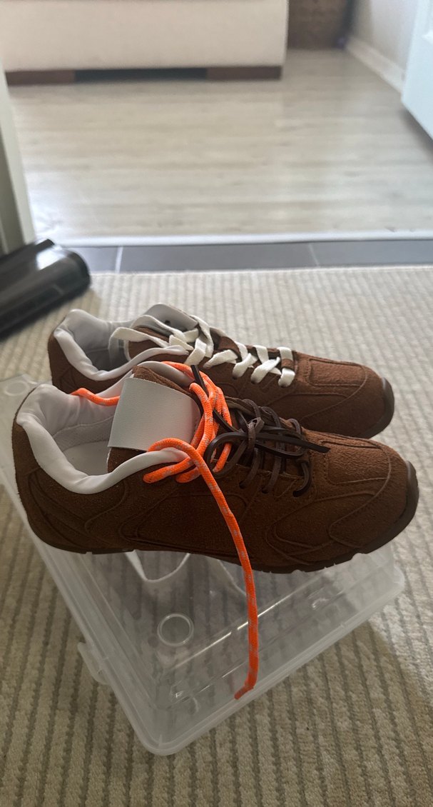 Kahverengi süet spor ayakkabı, stiletto topuklu ve bağcıklı tasarıma sahip. Trendy casual tarz için uygun bir sokak giyimi parçası.