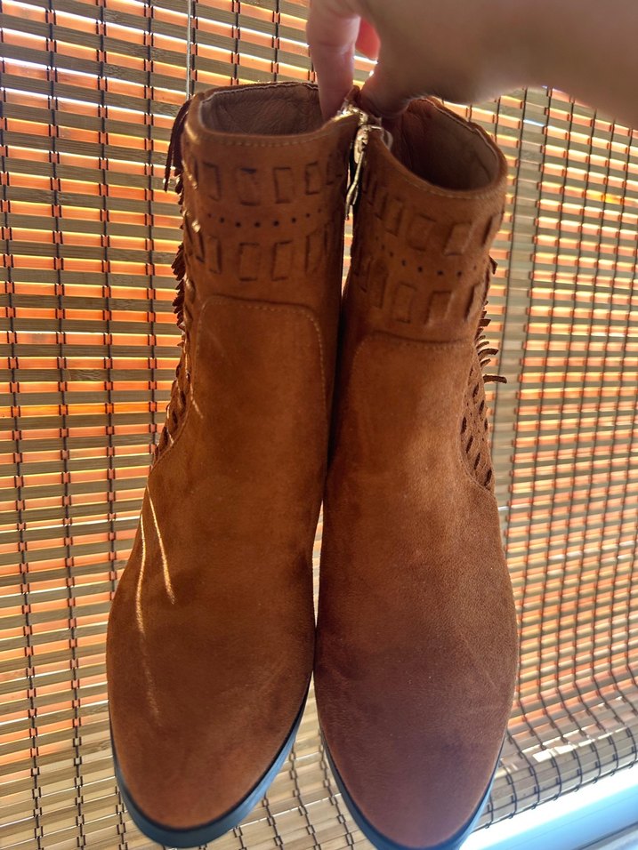 Kahverengi süet kadın botlar, kalın topuklu ve tokalı, rahat bohem tarzında günlük kullanım için uygun. Amerika’dan aldık.iade kabul etmiyorum.marka Zara değil