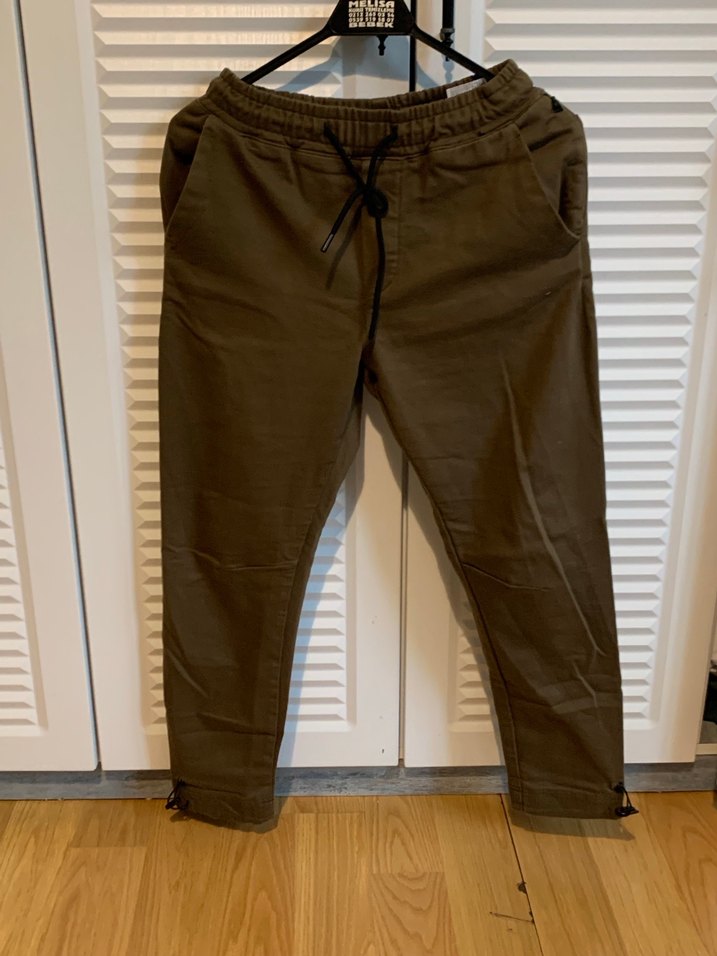 Haki süet kumaştan, bol kesim, kemerli, midi boy, desen içermeyen rahat sokak tarzı pantolonu. Günlük kullanım için uygundur.
