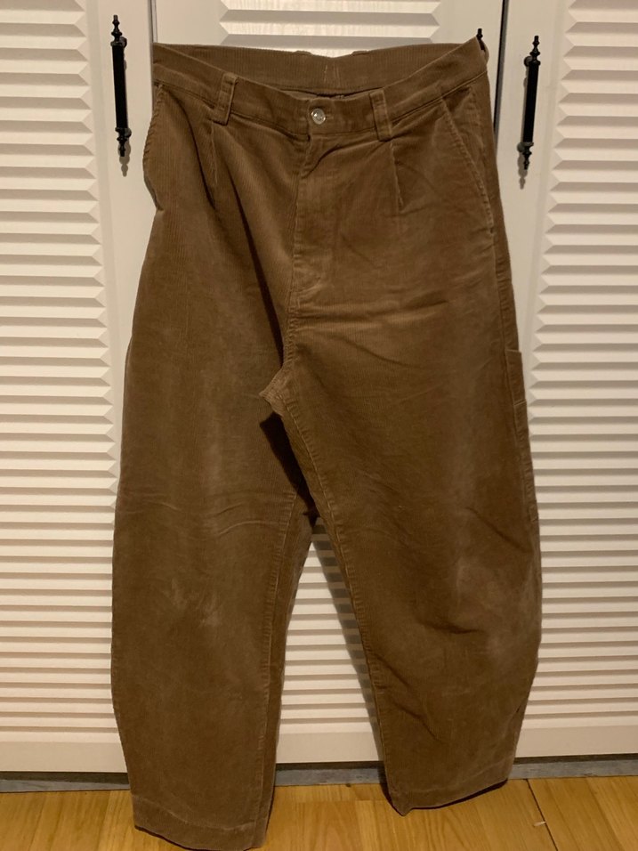 Kahverengi süet kumaştan, bol kesim ve kemerli erkek pantolonu, günlük rahat kullanıma uygundur.