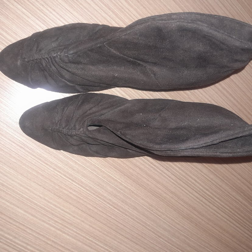Kahverengi süet bot, pileli tasarım ve ince stiletto topuklu. Minimalist ve gotik tarzda şık görünüme uygun.