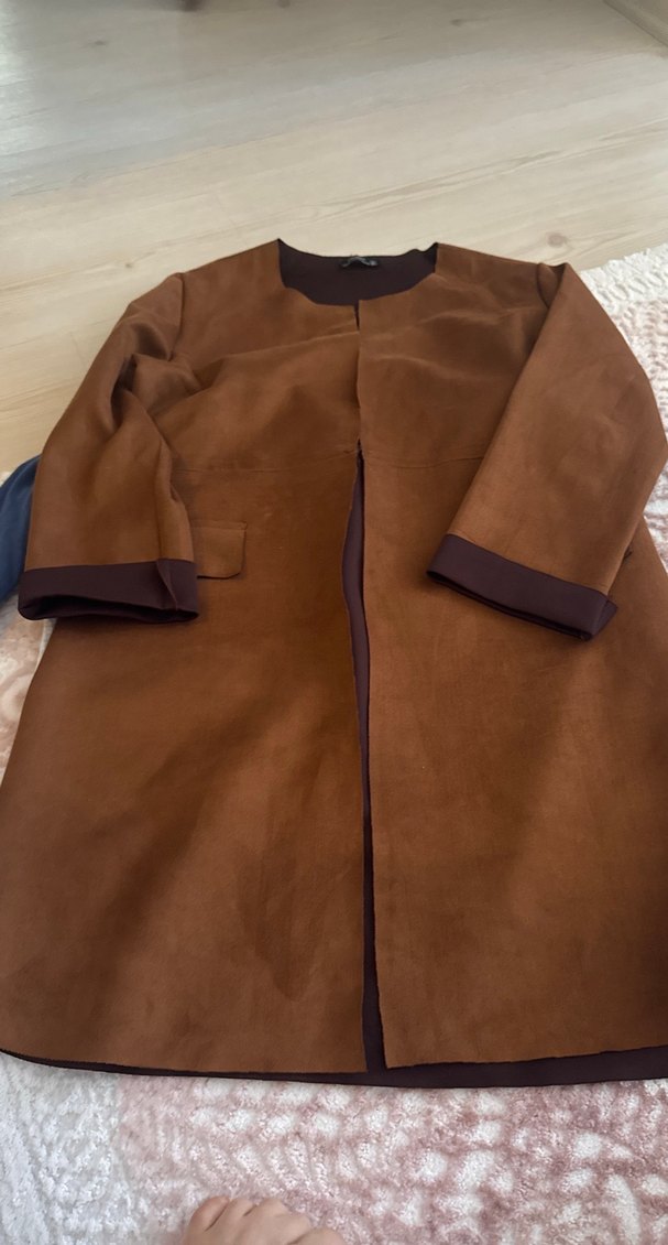 Kahverengi süet kumaştan yapılmış, düğmeli ve uzun kollu hamile kabanı. Normal kesim ve yakası çıtçıtlıdır, günlük kullanıma uygundur.