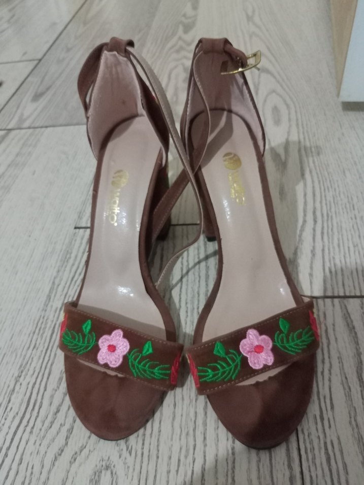 Kahverengi süet, çiçek işlemeli ve tokalı bilek kayışlı stiletto topuklu ayakkabı. 1-2 kere anca giyilmiştir temiz ürün. 38 numara