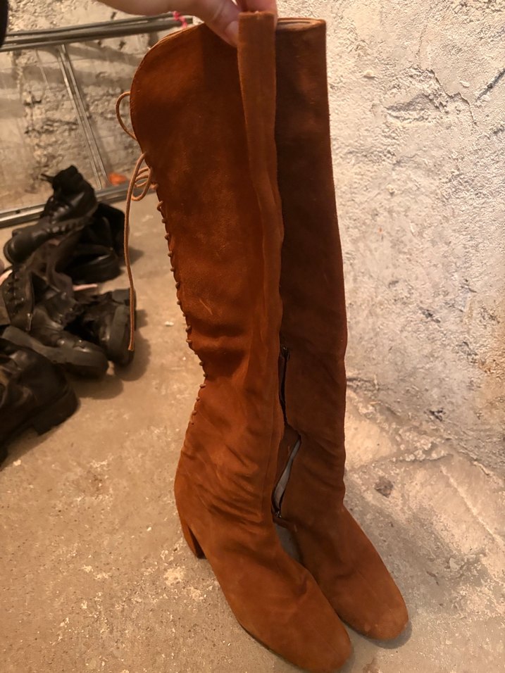 Kahverengi süet diz üstü çizme, stiletto topuklu ve fermuarlı yan detaya sahip, bohem tarz için uygun. Düz ve desensiz, retro ve rahat bir görünüme sahip.