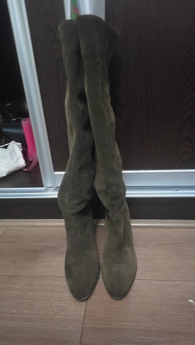 Kahverengi süet dizüstü stiletto topuklu, tokalı kadın botları, trend günlük kullanıma uygun. süet haki renk cok iyi durumda