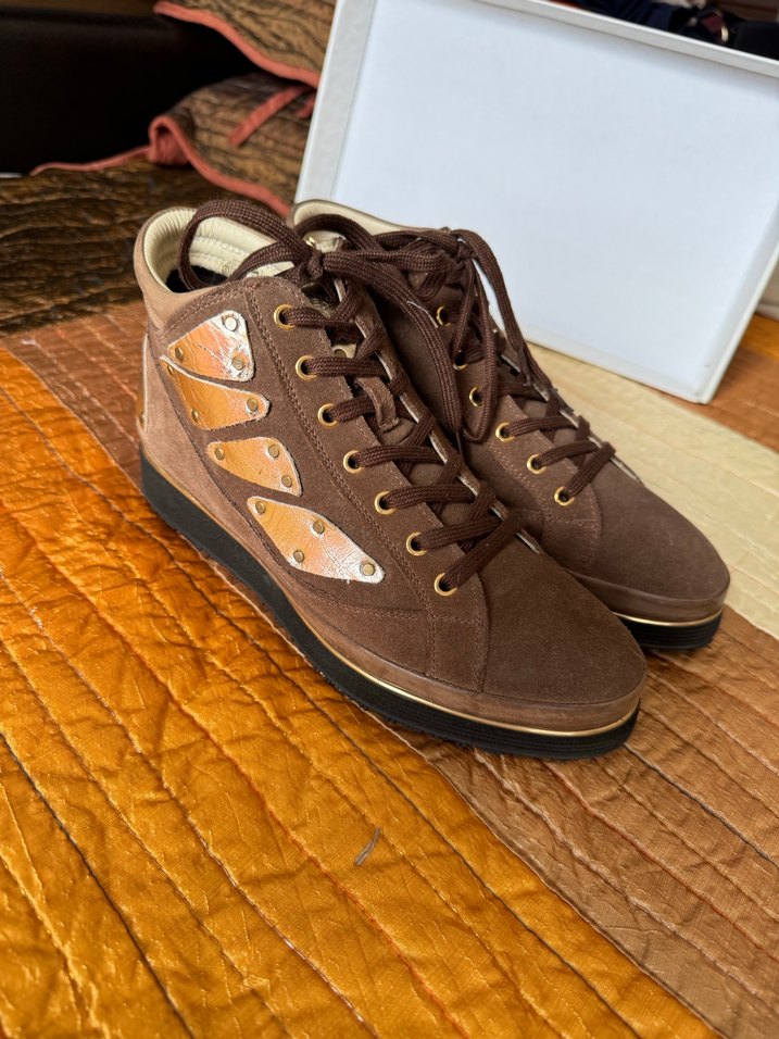 Kahverengi süet malzemeden, dolgu topuklu ve bağcıklı kadın spor bot. Günlük sokak stiline uygun sade tasarım.