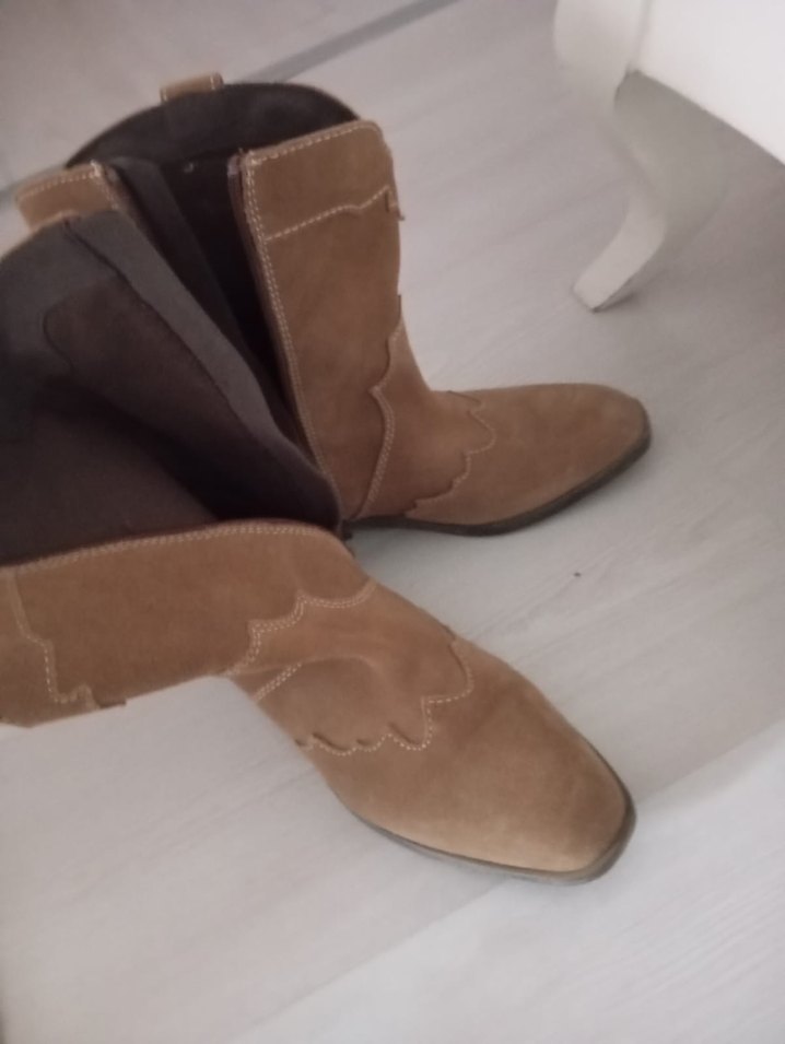 Kahverengi süet dolgu topuklu kadın botlar, tokalı detaylara sahip. Bohem tarzı, günlük kullanıma uygun rahat ve sıcak tasarım.