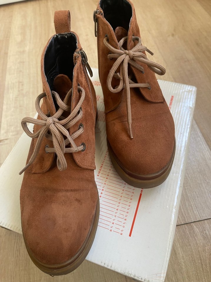 Kahverengi süet dolgu topuklu kadın bot, bağcıklı ve tokalı detaylara sahip. Rahat, günlük kullanıma uygun konforlu bir model.