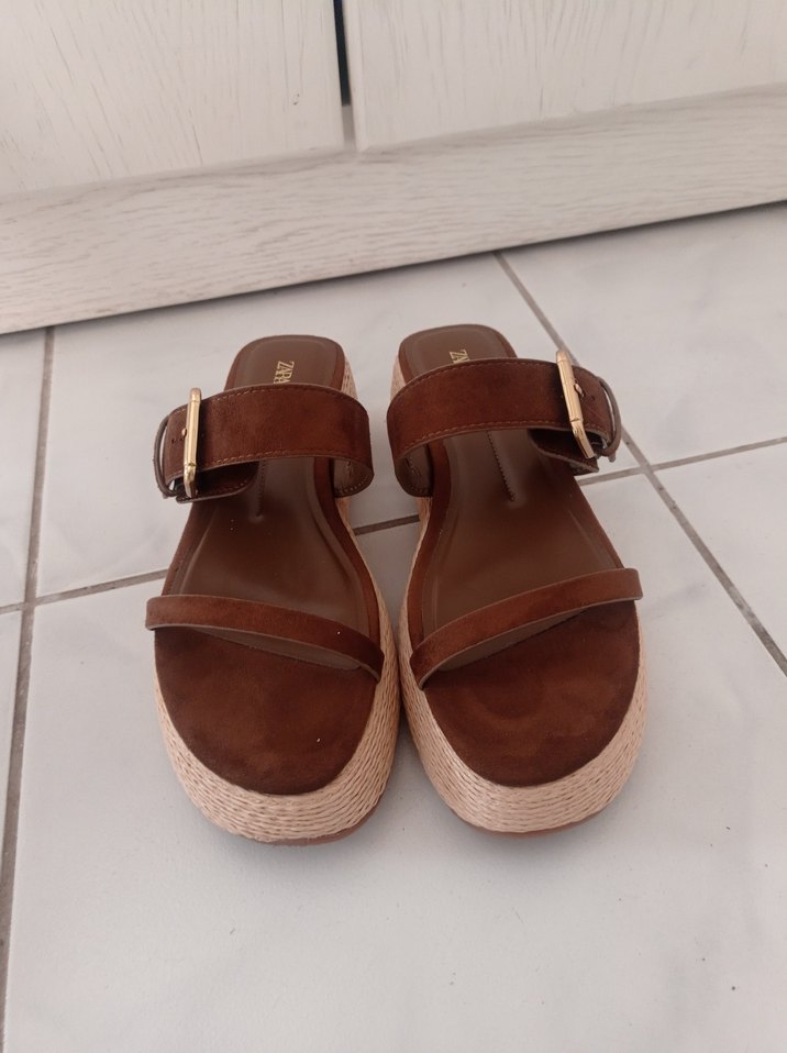 Kahverengi süet dolgu topuklu kadın sandalet, tokalı ve minimalist bohem tarzda, günlük kullanıma uygun. ✨