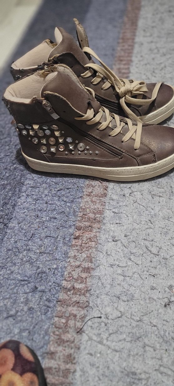 Kahverengi süet dolgu topuklu spor ayakkabılar, yan fermuar ve çivili detaylarla, nakışlı ve tokalı rock punk tarzında.