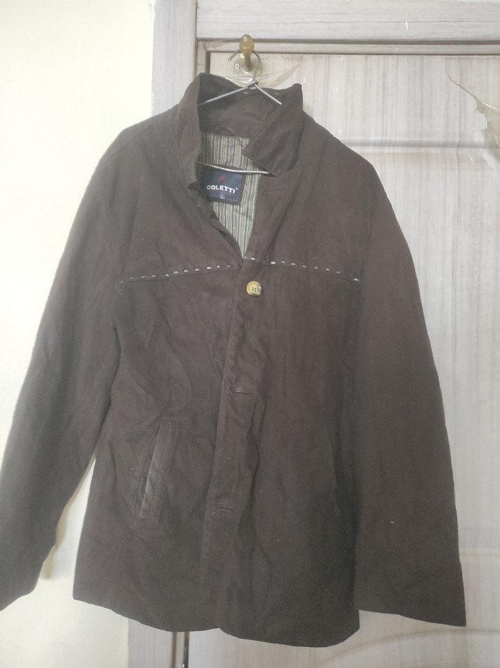 Kahverengi süet malzemeden yapılmış, düğmeli ve kesik yaka detaylı erkek ceketi. Normal kesim ve midi boyda, günlük rahat kullanıma uygun.
