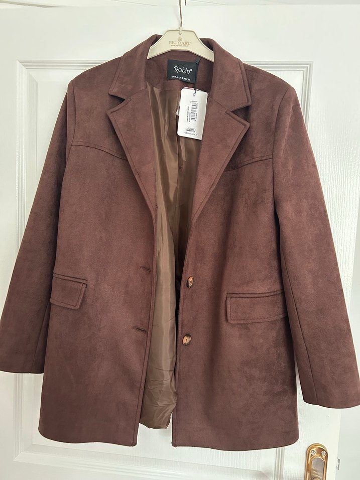 Kahverengi süet kumaştan, düğmeli, normal boy midi blazer. Uzun kollu, klasik kesim, sıfır etiketli