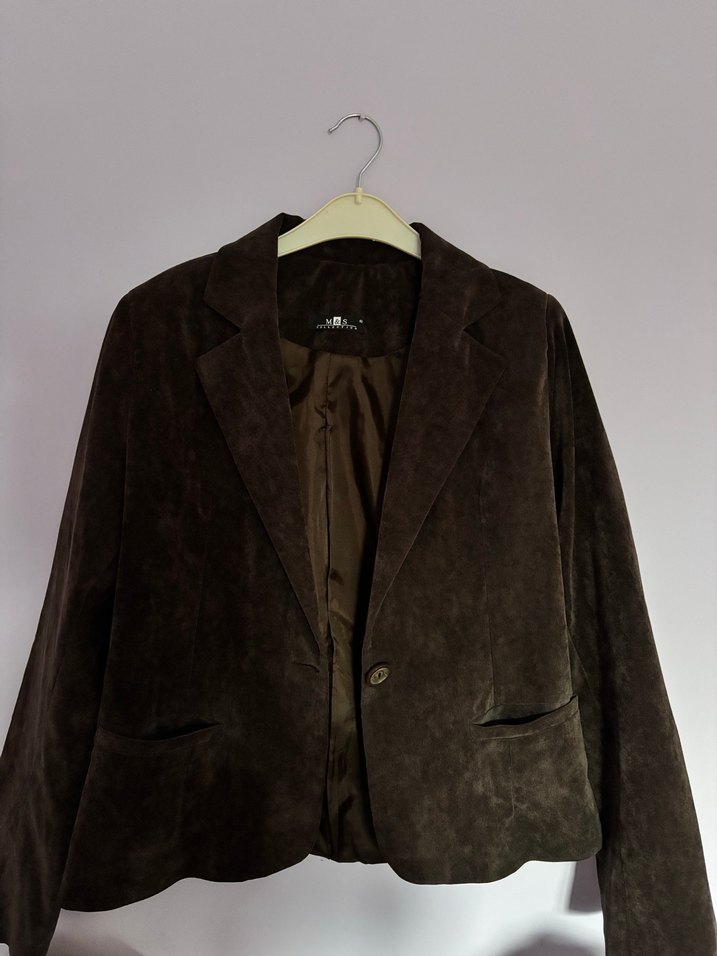 Kahverengi süet kumaştan kadın blazer, düğmeli ve uzun kolludur. Normal kesim ve midi boyda olup, ofis için uygundur. Ürün bir kere bile kullanılmadı yeni